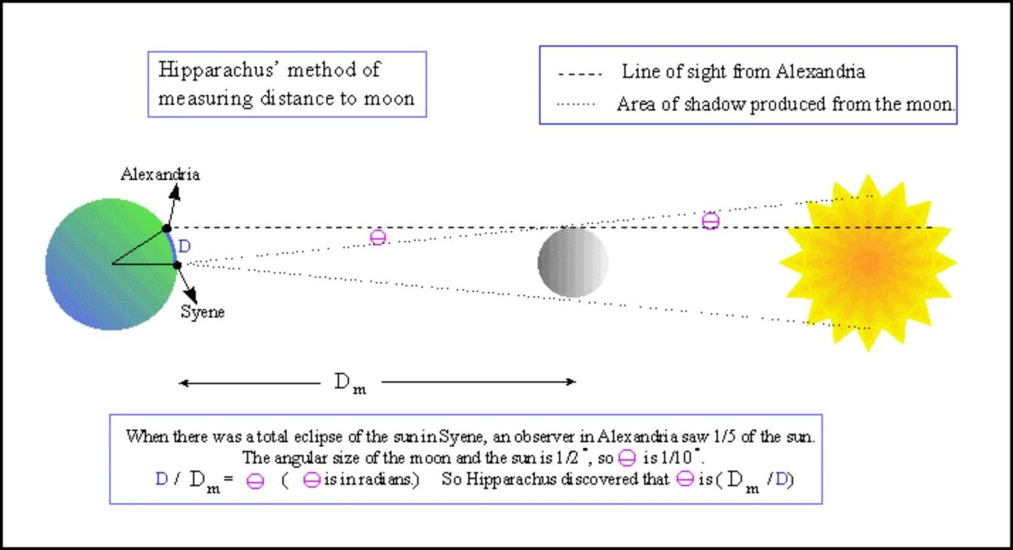 Το 129 π. Χ. μία Ηλιακή Έκλειψη τον βοήθησε να προσδιορίσει ότι η διάμετρος της Σελήνης είναι ίση με το 1/3 της γήινης όταν οι σημερινές τιμές αναφέρουν την διάμετρο της Γης ίση με 12.756 χιλιόμετρα και την διάμετρο της Σελήνης ίση με 3.476 χιλιόμετρα. Την ίδια περίοδο υπολόγισε επίσης ότι η απόσταση της Σελήνης κυμαίνεται από 59 έως 67,3 γήινες ακτίνες, γι’ αυτό άλλωστε η Σελήνη στο περίγειο της φαίνεται μεγαλύτερη απ’ ότι στο απόγειό της.
