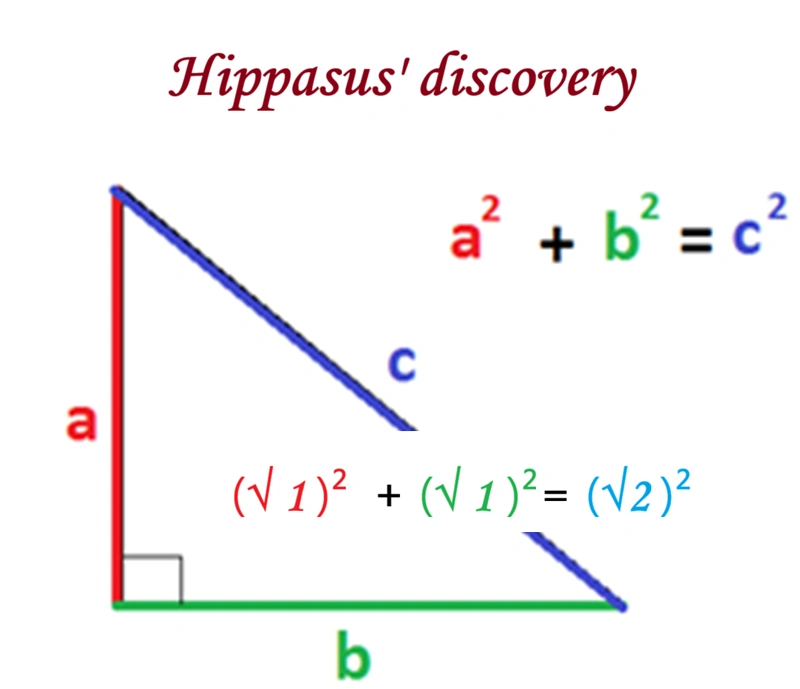 - η άλλη ότι αποκάλυψε την μυστική διδασκαλία των αρρήτων αριθμών.[2] Ο Ίππασος φέρεται να έχει ανακαλύψει το ότι η τετραγωνική ρίζα του δύο, ή καλύτερα η διαγώνιος ενός τετραγώνου με πλευρά 1, είναι άρρητος αριθμός.