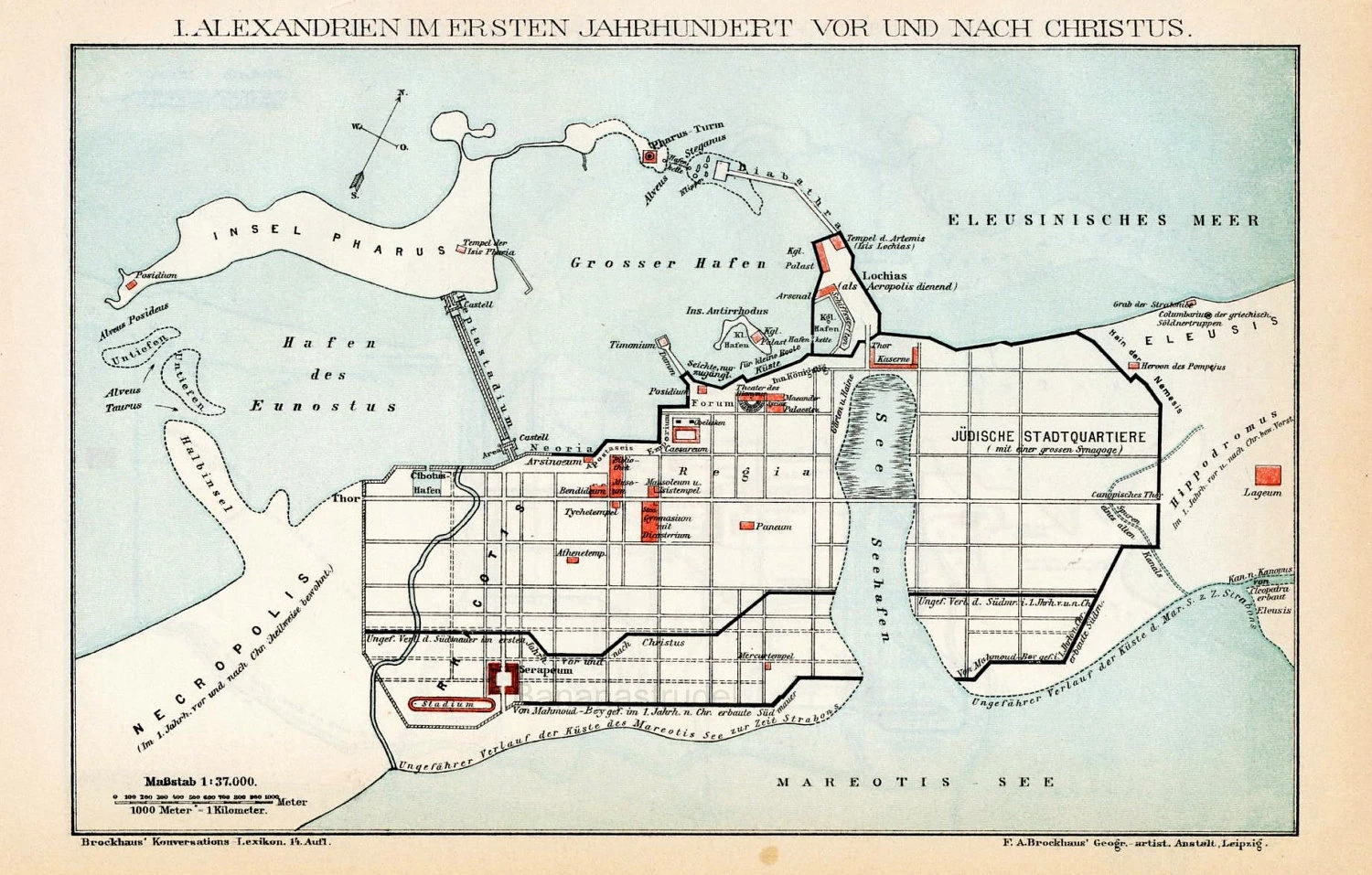 Η νέα πόλη περιέβαλε την παλαιότερη Αιγυπτιακή κώμη ("Ράκωτις"), η οποία αργότερα αποτέλεσε το οικιστικό κέντρο των εντοπίων και κατέληξε να μετατραπεί στο δυτικό τμήμα της νέας πόλης.