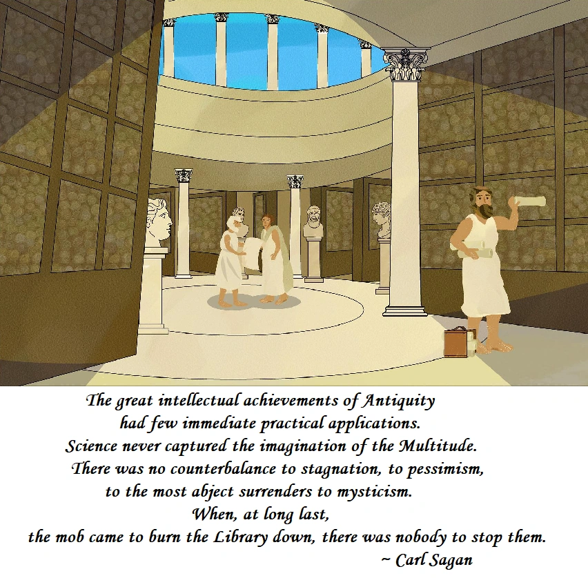 Here clearly were the seeds of the modern world. What prevented them from taking root and flourishing? Why instead did the West slumber through a thousand years of darkness until Columbus and Copernicus and their contemporaries rediscovered the work done in Alexandria? I cannot give you a simple answer. But I do know this: there is no record, in the entire history of the Library, that any of its illustrious scientists and scholars ever seriously challenged the political, economic and religious assumptions of their society. The permanence of the stars was questioned; the justice of slavery was not. Science and learning in general were the preserve of a privileged few. The vast population of the city had not the vaguest notion of the great discoveries taking place within the Library. New findings were not explained or popularized. The research benefited them little. Discoveries in mechanics and steam technology were applied mainly to the perfection of weapons, the encouragement of superstition, the amusement of kings. The scientists never grasped the potential of machines to free people. The great intellectual achievements of antiquity had few immediate practical applications. Science never captured the imagination of the multitude. There was no counterbalance to stagnation, to pessimism, to the most abject surrenders to mysticism. When, at long last, the mob came to burn the Library down, there was nobody to stop them.