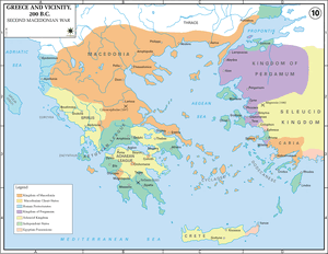 Η Μακεδονία ήταν το πρώτο ελληνιστικό κράτος που υπέκυψε στους Ρωμαίους. Οι δύο δυνάμεις, η Ρώμη και η Μακεδονία συγκρούσθηκαν για την κυριαρχία στην κυρίως Ελλάδα (Β' Μακεδονικός Πόλεμος) (200-197).