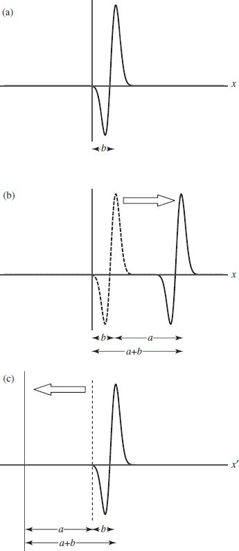 - Θέλοντας να "εξανθρωπίσουμε" περισσότερο τα πράγματα, θα θεωρήσουμε ότι ο θεωρηθείς χώρος "αντιπροσωπεύεται" από μία θαλασσινή επιφάνεια στην οποία βρίσκεται ακίνητη μία δισδιάστατη βάρκα που "αντιπροσωπεύει" το φυσικό σύστημα. Μέσα σε αυτήν (στο κέντρο βάρους της) βρίσκεται ο κινούμενος παρατηρητής.