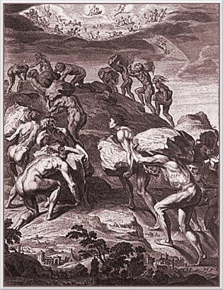 Οι Γίγαντες εκρίζωναν ολόκληρα πετρώματα και τα τοποθετούσαν το ένα πάνω στο άλλο ώστε να εισβάλλουν στην υψηλότερη κορυφή του Ολύμπου, όπου βρισκόταν το Ολυμπιακό άδυτο, το ανάκτορο του ίδιου του Δία.