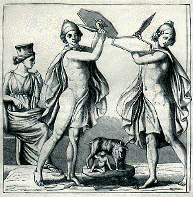 Oι Κουρήτες, όπως και στη θεογονία του Aπολλόδωρου, χτυπούσαν τα δόρατά τους θορυβώντας, για να καλύψουν το κλάμα του βρέφους.