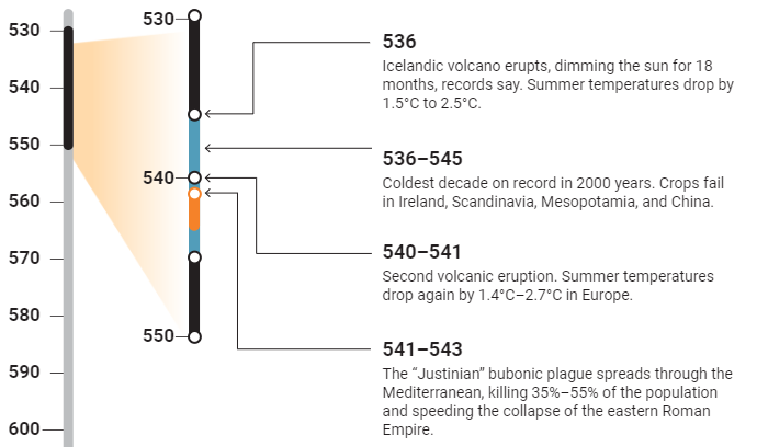 αυτή η πανώλης συνέβαλε στην κατάρρευση της Αυτοκρατορίας. Ο ηφαιστειακός χειμώνας του 536 ήταν το σοβαρότερο και παρατεταμένο επεισόδιο κλιματικής ψύξης στο βόρειο ημισφαίριο τα τελευταία 2.000 έτη. Ο ηφαιστειακός χειμώνας προκλήθηκε από τουλάχιστον τρεις ταυτόχρονες εκρήξεις αβέβαιης προέλευσης, με διάφορες πιθανές τοποθεσίες που προτείνονται σε διάφορες ηπείρους.)