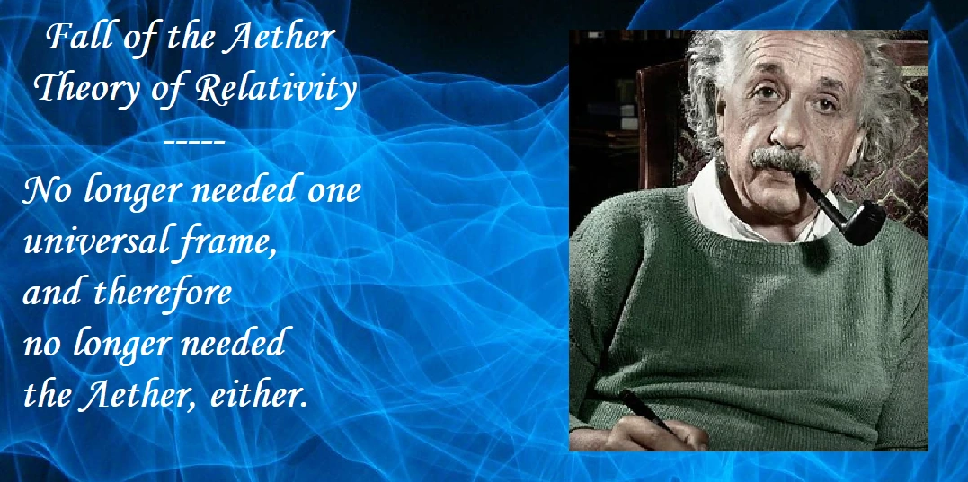 Είναι γνωστή η συνέχεια της ιστορίας. Διάφορα πειράματα, με κυριότερο το πείραμα συμβολής των Michelson και Μοrley, έδειξαν ότι δεν υπάρχει απόλυτο σύστημα αναφοράς και έτσι η Κινηματική καθορίζεται από την Ειδική θεωρία της Σχετικότητας, η οποία δεν δέχεται κανένα απόλυτο σύστημα αναφοράς και θεωρεί τις διάφορες κινήσεις μόνο σχετικές μεταξύ τους. Αν και η Ειδική θεωρία της Σχετικότητας κατήργησε την έννοια του αιθέρα, εν τούτοις, μετά από 10 έτη, μέσα από τη Γενική θεωρία της Σχετικότητας αυτή τη φορά, επιχειρείται να επανέλθει μια νέα μορφή της έννοιας αυτής.