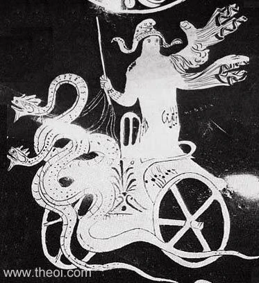 Στην συνέχεια η Μήδεια ανέβηκε σε ένα άρμα που το έσυραν πτερωτοί δράκοντες και πήγε στην Αθήνα, όπου συζεύχθηκε με τον Αιγέα και απέκτησε τον Μήδο.