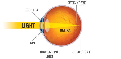 Οι ακτίνες που έχουν ως πηγές τους τα φωτεινά αντικείμενα, περνούν τα διαθλαστικά μέσα και συγκεντρώνονται πάνω στον αμφιβληστροειδή. Η απεικόνιση των αντικειμένων που βλέπει δημιουργεί νευρική διέγερση, που με το Οπτικό Νεύρο μεταφέρεται στον εγκέφαλο.
