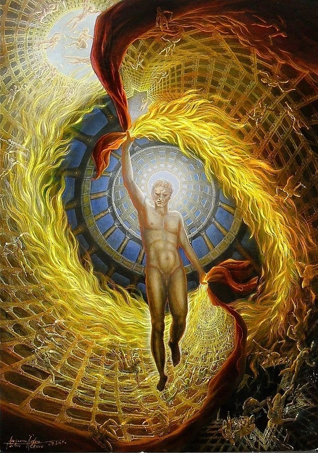 Ο νεο- δημιουργηθείς Άνθρωπος λαμβάνει την Λογική από τον δημιουργό του, τον Προμηθέα (στην θέση του μεταγενέστερου Χριστιανικού Θεού)