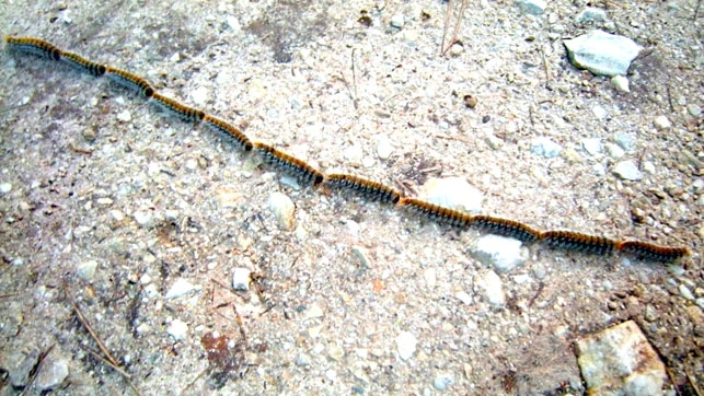 Pine processionary caterpillars often link into a long train to move through trees and over the ground. Defensive behavior (to scare away potential supervised predators) (!) The birds perceive the caterpillars for snakes so they don't eat them. A look down upon (!!) Was there, once, a creator (from "Above") who introduced thereby salvation in the "behavior" of the caterpillar? Who knew???? A crucial question to evolutionary science.