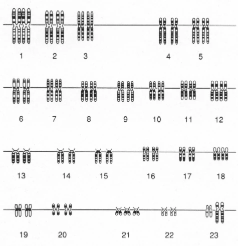 Схематическое изображение кариотипа мужчины, страдающего синдромом Дауна. Нерасхождение хромосом 21 в мейозе привело к трисомии по этой хромосоме.