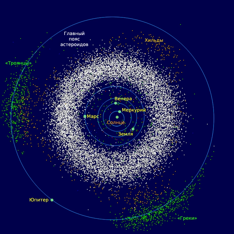 Главный пояс астероидов (белый цвет) и троянские астероиды Юпитера (зелёный цвет)