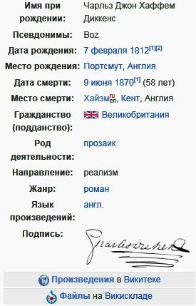 Ча́рльз Джон Ха́ффем Ди́ккенс (англ. Charles John Huffam Dickens [ˈtʃɑrlz ˈdɪkɪnz]; 7 февраля 1812 года, Портсмут, Англия — 9 июня 1870 года, Хайэм, Англия) — английский писатель, романист и очеркист. Самый популярный англоязычный писатель при жизни. Классик мировой литературы, один из крупнейших прозаиков XIX века. Творчество Диккенса относят к вершинам реализма, но в его романах отразились и сентиментальное, и сказочное начало. Самые знаменитые романы Диккенса (печатались отдельными выпусками с продолжением): «Посмертные записки Пиквикского клуба», «Оливер Твист», «Дэвид Копперфильд», «Большие надежды», «Повесть о двух городах». https://ru.wikipedia.org/wiki/%D0%94%D0%B8%D0%BA%D0%BA%D0%B5%D0%BD%D1%81,_%D0%A7%D0%B0%D1%80%D0%BB%D1%8C%D0%B7