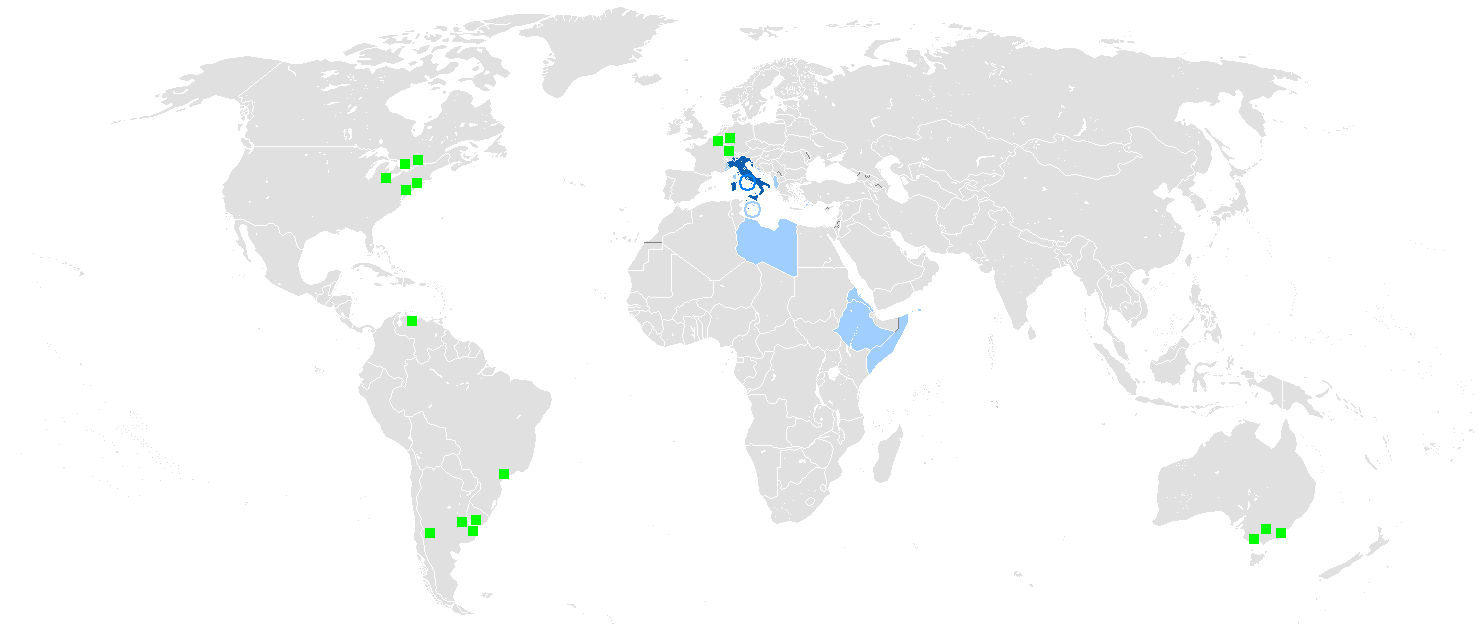 Италия, Сан-Марино, Ватикан, Швейцария, Словения, Хорватия, Франция, Монако, Ливия, Тунис, Эритрея, Эфиопия, Сомали, Мальта, Албания, Венесуэла, Аргентина, Бразилия, США |