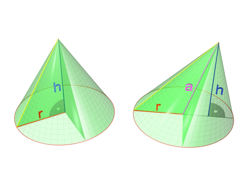Прямой и косой круговой конусы с равным основанием и высотой. Эти тела обладают одинаковым объёмом.