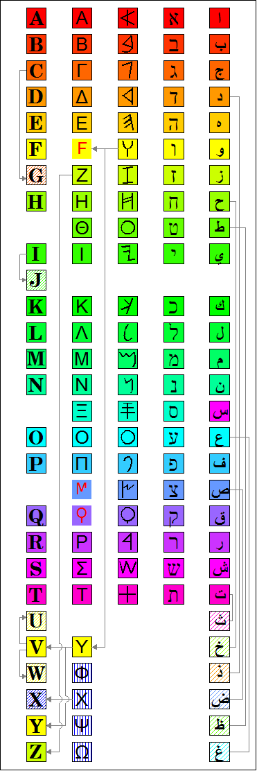 В колонках слева направо: латинский, греческий, финикийский, еврейский и арабский алфавиты. Стрелками показано происхождение отдельных букв.