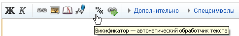 - Выше текстовой формы редактирования находятся кнопки для форматирования текста, ниже — панель быстрой вставки специальных символов, элементов вики-разметки и шаблонов. Среди них кнопка викификатора, которой не следует пренебрегать. Перед тем, как записать страницу, не забывайте нажать на эту кнопку.