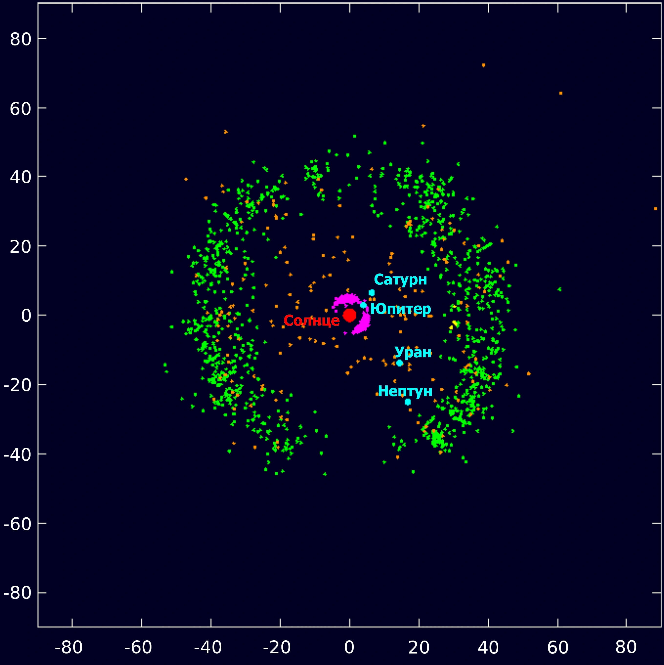 Известные объекты пояса Койпера, по данным Центра малых планет. Объекты основного пояса показаны зелёным, рассеянного диска — оранжевым. Четыре внешних планеты имеют голубой цвет. Троянские астероиды Нептуна показаны жёлтым, Юпитера — розовым. Рассеянные объекты между Солнцем и поясом Койпера известны как кентавры. Масштаб показан в астрономических единицах. Пробел в нижней части рисунка вызван нахождением в этой области полосы Млечного пути, скрывающей тусклые объекты