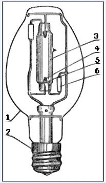 Устройство лампы ДРЛ: 1.Колба;2.Цоколь;3.Горелка;4.Основной электрод;5.Поджигающий электрод;6.Токоограничительный резистор