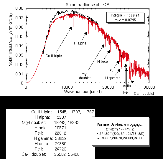 Спектр излучения Солнца, наблюдаемый выше атмосферы Земли и на уровне моря