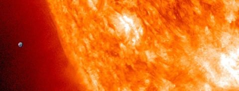 Земля и Солнце (фотомонтаж с сохранением соотношения размеров)