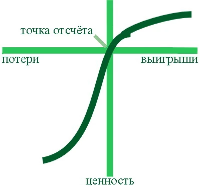 Оценки полезности потерь и выигрышей делаются людьми относительно некоторой точки отсчёта (гипотеза относительной полезности). Функция ценности (эскизно показанная на рисунке справа), которая проходит через точку отсчёта, имеет асимметричный s-образный вид и показывает, что при одном и том же абсолютном значении ценности воздействие потери сильнее, чем воздействие выигрыша (гипотеза «фабрикации» полезности).
