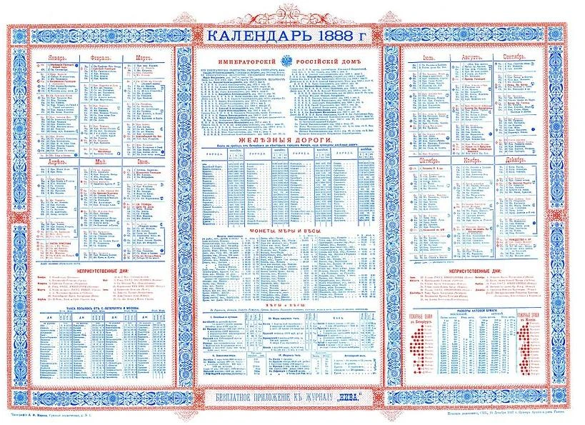 Календарь на 1888 год из приложения к журналу «Нива»